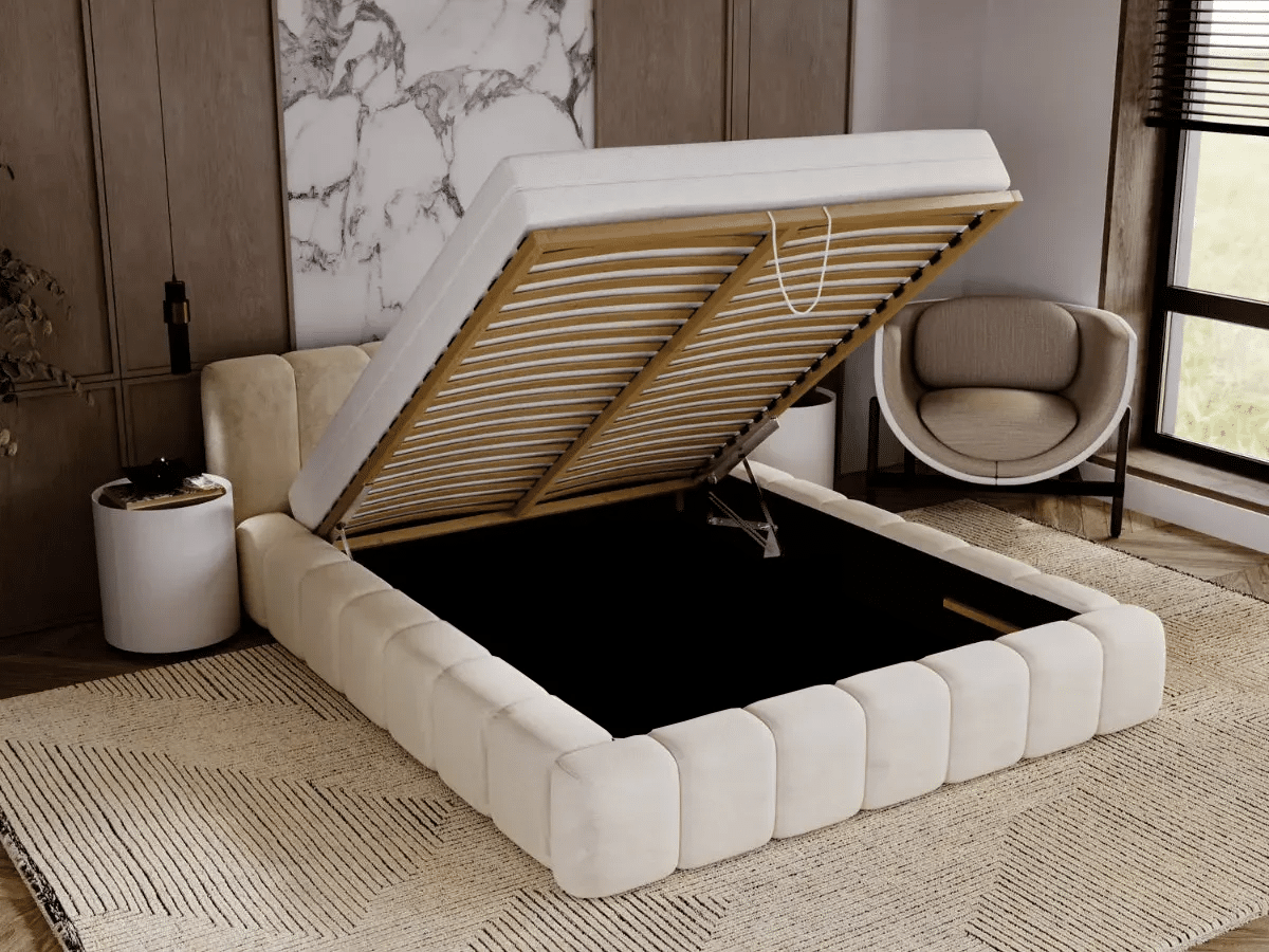 Plutôt que d’ajouter une commode ou des boîtes encombrantes, le lit coffre exploite intelligemment l’espace sous le matelas. Et dans une chambre, chaque centimètre compte.